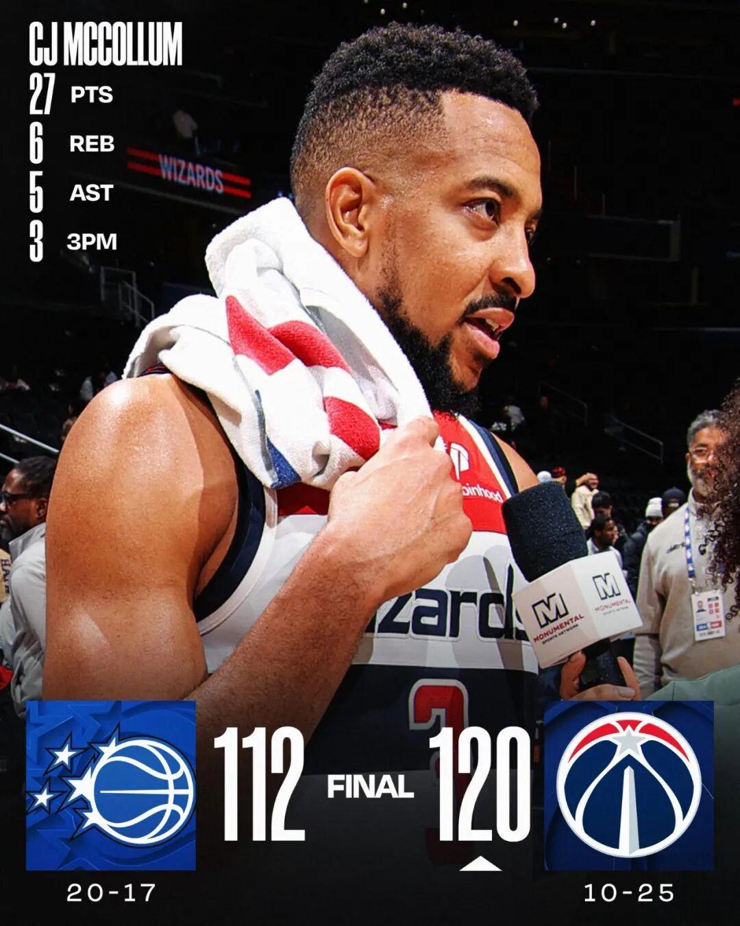 常规赛,奇才主场120-112战胜魔术。